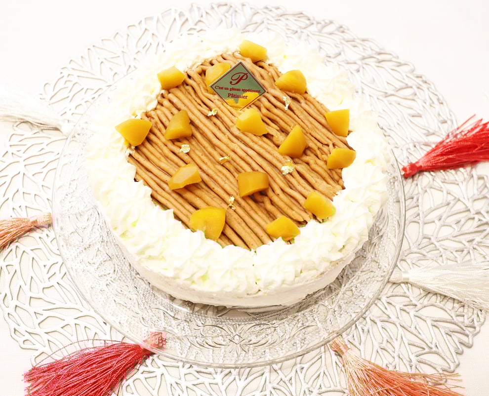 食品ロスを減らすべく、甘露煮と加賀の金箔でおやつ用のデザートを作ってみました。【金箔モンブラン 18cmホール】です。トップの味を引き立たせたいのでスポンジの甘さを抑えました。絞りが一部分、曲線になってしまい反省ですが・・💦