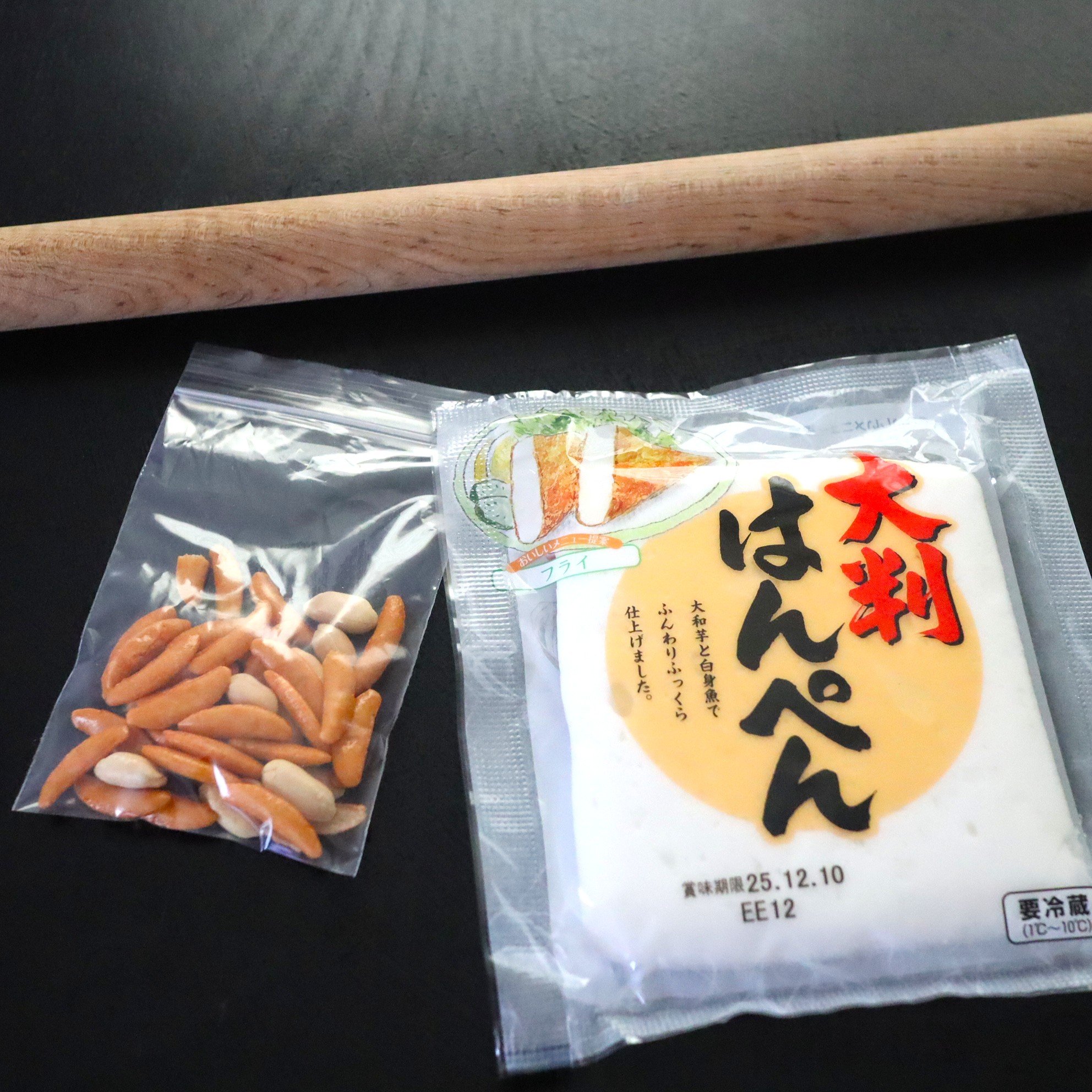 - 講師:「はい、生食できます。魚のすりみや山芋を混ぜたあとに茹でて作られています。生で食べるとスカスカして口当たりがよくないので今月のレッスンでは、はんぺんに柿の種をまぶして仕上げるレシピです」