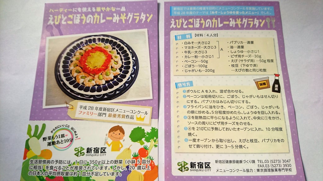 新宿区メニューコンクール最優秀賞を受賞したレシピ『えびとごぼうのカレーみそグラタン』のレシピカードを、以下の場所で新宿区により配布中です。