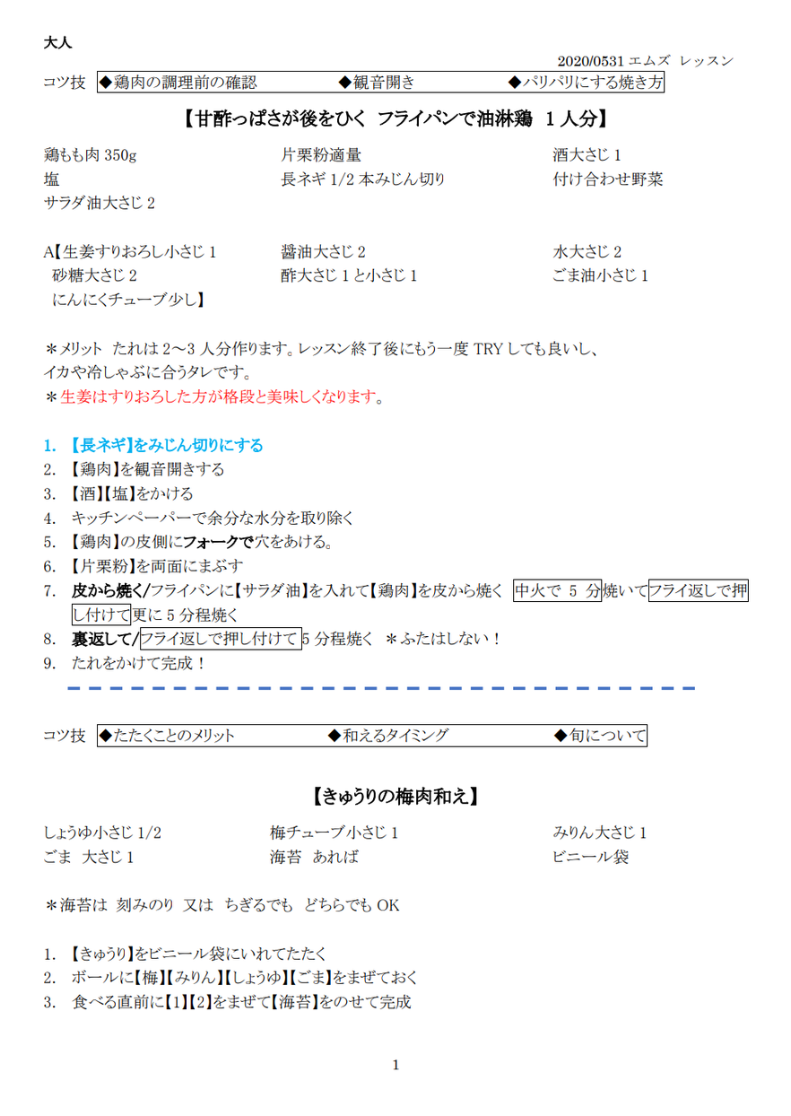 油淋鶏のタレ【A】は鶏もも肉2枚分の分量ですが『当日は1枚=350g分だけご一緒に』料理します。レッスン後に(2枚目の鶏もも肉または冷しゃぶ等に)ご活用ください。